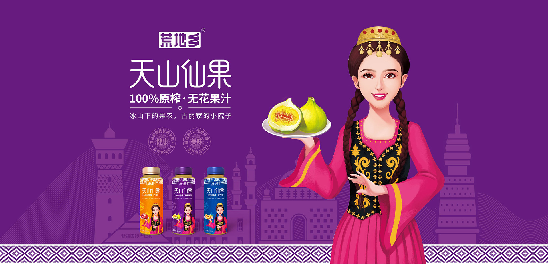 一名新疆少女手拿无花果,好像在说:“欢迎您到新疆来!”——不仅强调了“来自新疆”的概念,而且能使产品更有亲和力。
